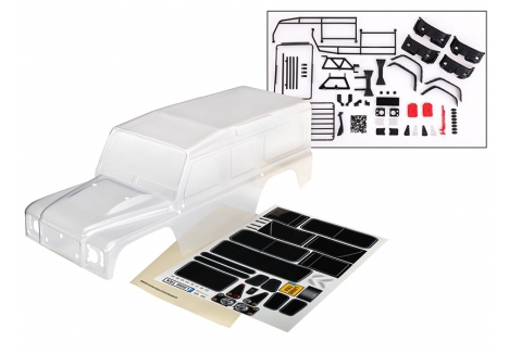 Traxxas Body, Land Rover Defender, complete (Clear, trimmed, requires painting) (includes grille, side mirrors, door handles, windshield wipers, ExoCage, spare Tyre mount, decals, window masks) TRX8011P