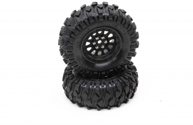These Duratrax® SHOWDOWN front and rear tires are Class 1 (4.19" outer diameter) size for maximum scale appearance, with a 1.9" inner tire/outer wheel diameter. Made from super-soft C3 compound rubber with an aggressive tread that bites into loose or muddy surfaces, these tires provide exceptional gripping power for climbing over slippery rocks and getting past the toughest obstacles. They include foam inserts and arrive factory-mounted to 12mm hex wheels that are molded from a durable black composite plastic. Sold in pairs.