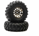These Duratrax® SHOWDOWN front and rear tires are Class 1 (4.19" outer diameter) size for maximum scale appearance, with a 1.9" inner tire/outer wheel diameter. Made from super-soft C3 compound rubber with an aggressive tread that bites into loose or muddy surfaces, these tires provide exceptional gripping power for climbing over slippery rocks and getting past the toughest obstacles. They include foam inserts and arrive factory-mounted to 12mm hex wheels that are molded from a durable black chrome composite plastic. Sold in pairs.