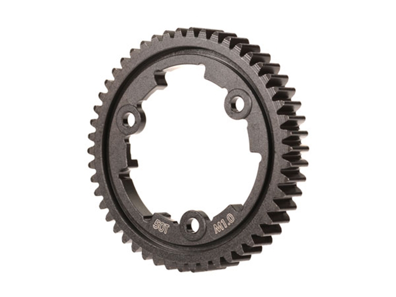 50-tooth spur gear (1.0 metric pitch) is machined from hardened steel with extra-wide steel teeth for ultimate power handling and durability. Traxxas spur gears let you fine-tune the performance of your Traxxas model. Changing gear ratios can help balance acceleration and top speed for different running conditions. Please consult your owners manual for more information on recommended gearing options for your specific model.