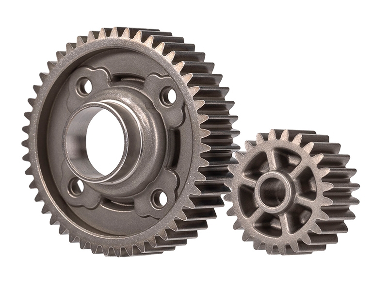 The overdrive gear set for X-Maxx® and XRT® replaces the standard transmission gears with a 24-tooth input gear and 47-tooth output gear. The overdrive gear set increases the upper range of gearing options beyond standard high-speed gears for aftermarket low kV motors. This gear set makes a significant change to the final drive ratio, effectively adding 5-6 teeth to the pinion gear.