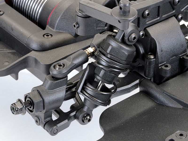 Oil filled shock absorbers, anti-roll bars and adjustable double wishbone suspension lets you tweak to suit your settings and tyre choice; either treaded rubber tyres for street racing, featuring 25mm wide front and 30mm wide rear for better stability at high speed or hard plastic boots on 6-spoke wheels for sideways drift driving.