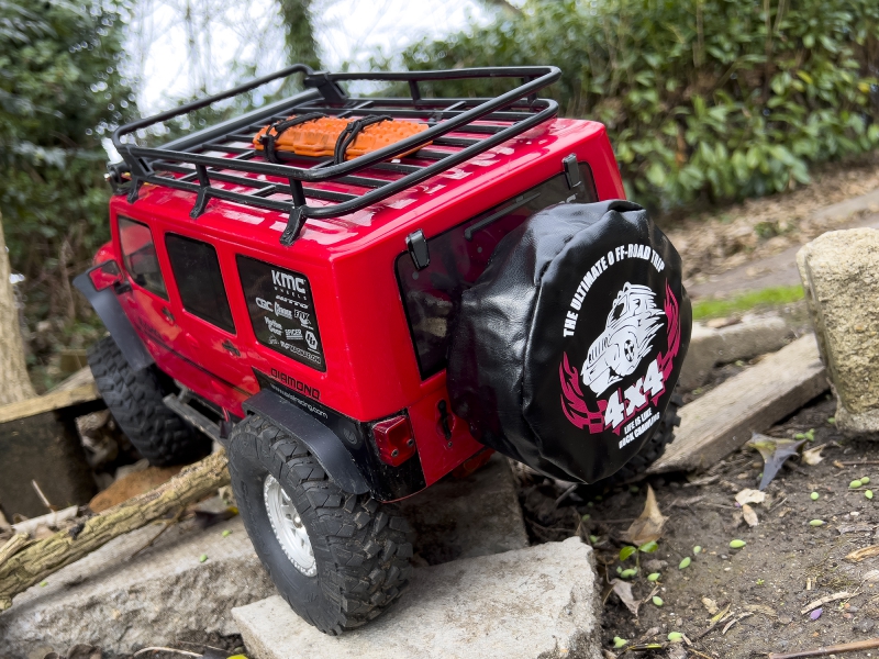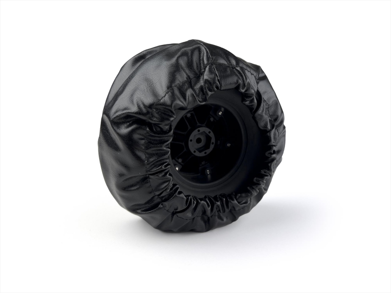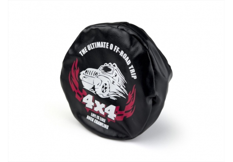 This spare wheel cover is made from a faux leather material and is screen printed with a two tone design that is bound to speak to all manner of off road enthusiasts. With an elasticated opening on the back side, it can stretch to fit around a multitude of 1/10th scale sized wheels adding a touch of realism to your off road vehicle.