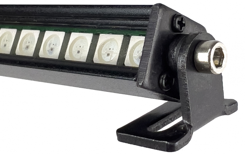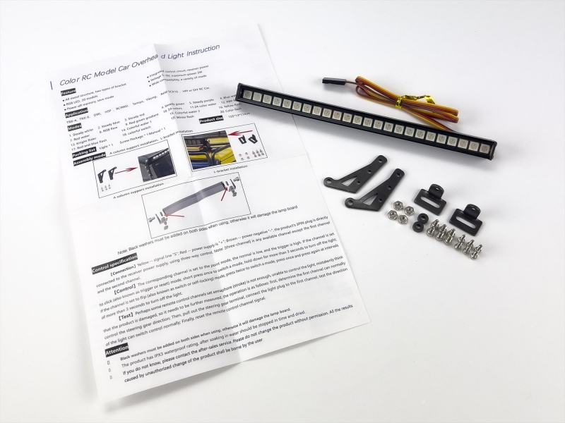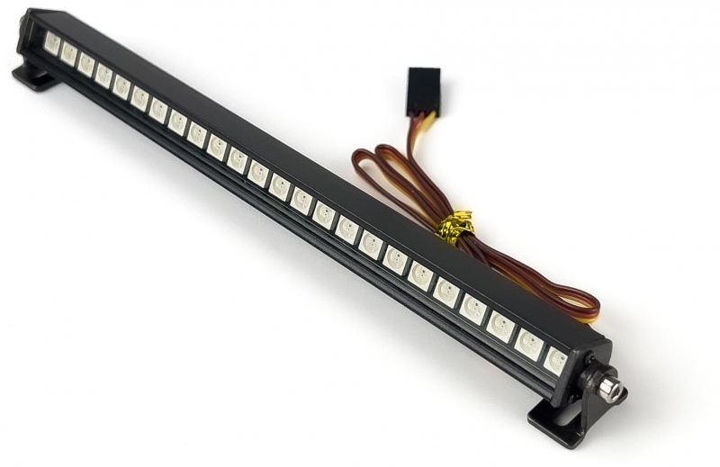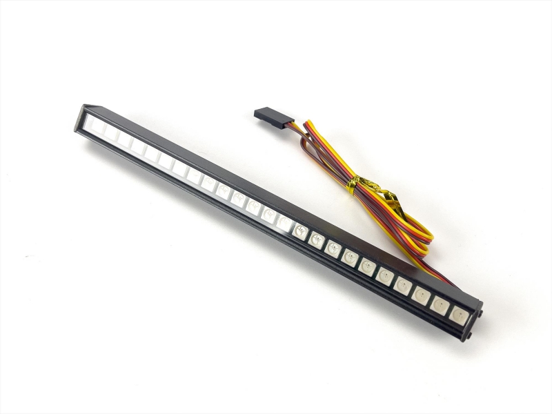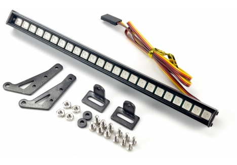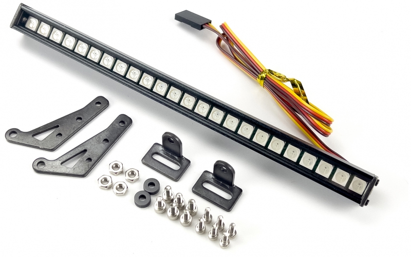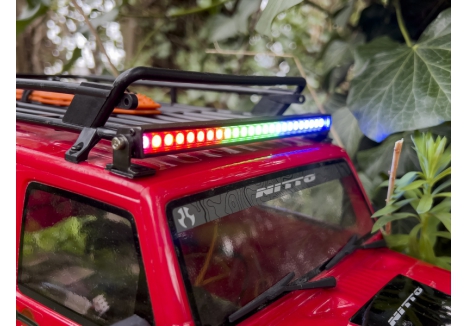 The kit includes a column support fixing and L-Bracket fixings allowing you to fit this bar in a number of positions on a bodyshell, off a bumper or even a roof rack! The light bar has a 15inch long cable that once connected to your auxiliary (or any other spare channel on the receiver with a switch/button assigned to it on the radio) you will be able to cycle through the 20 different light modes. There light modes range from a Steady bright white mode that can illuminate the darkest of trails, through to a colourful flashing mode that is certain to dazzle!