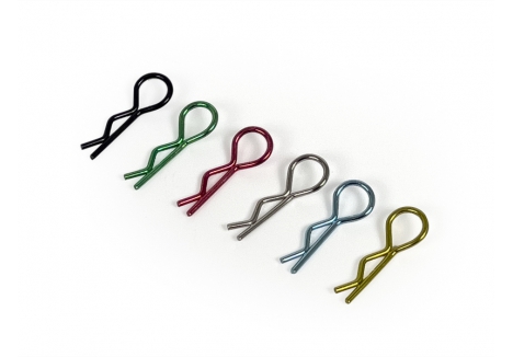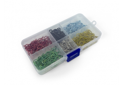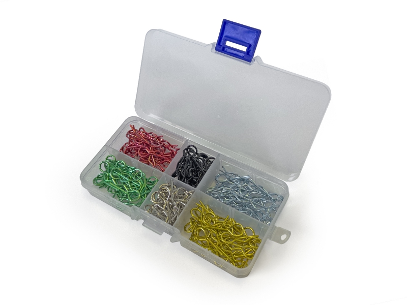 Perfect sized 1/10th, 1/12th body clip with medium sized loop for easier fitment, and removal. 180pcs set which comes in a convenient plastic divider box.