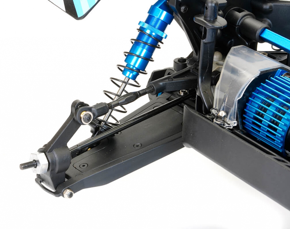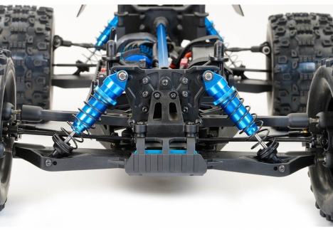 Long throw, double wishbone suspension with pivot ball front set-up, feature reinforced lower arms for less flex, while aluminium adjustable, oil filled big bore shock absorbers, finished in stylish blue are ready for what awaits on each corner.