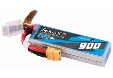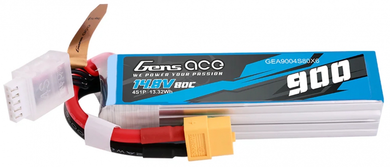 Gens Ace 900mAh 4S 80C Lipo battery is a high-quality lipo battery; produced by Gens Ace lipo battery manufacturers; max continuous discharge is 80C; Gens Ace 900mAh 14.8V 80C 4S1P Lipo Battery Packs are suitable for F5J and performance motorgliders.