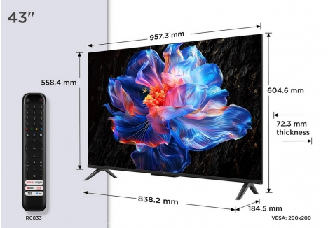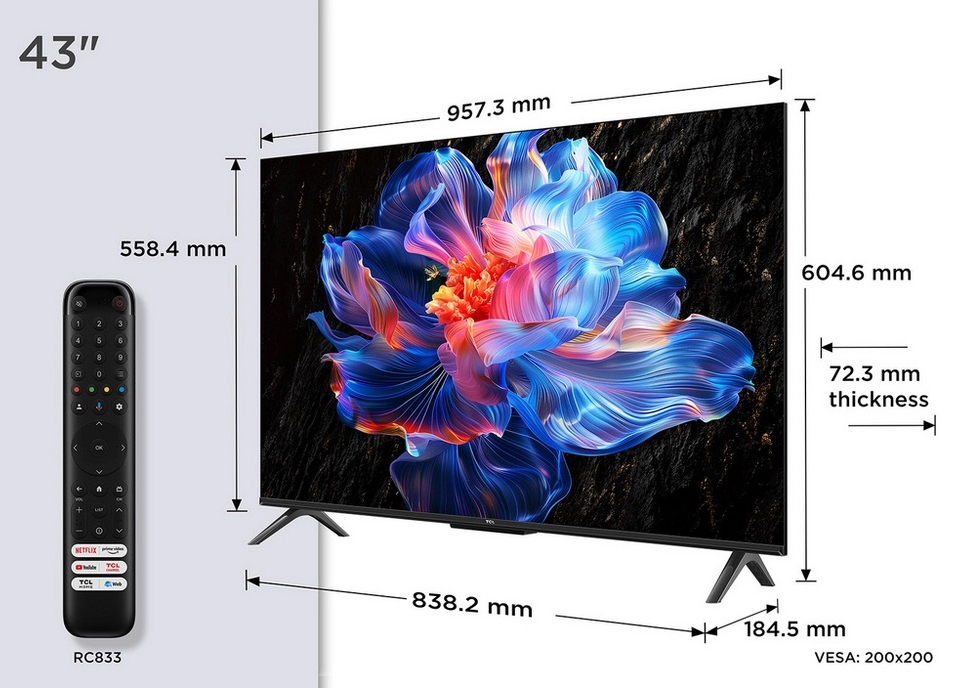 The TCL 43V6C-UK HDR TV with Dolby Vision is designed for versatility and style. Its slim profile (7.2 cm depth) and lightweight build (5.46 kg) make it easy to install using the 200 × 200 mm VESA interface. The black finish complements contemporary décor, while the intuitive interface ensures that content is always within reach. With Bluetooth, Wi-Fi, and Smart Connect features, the television integrates effortlessly with mobile devices and smart home platforms, offering a connected experience that adapts to your lifestyle.