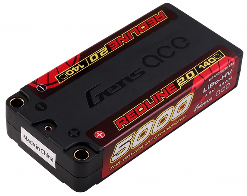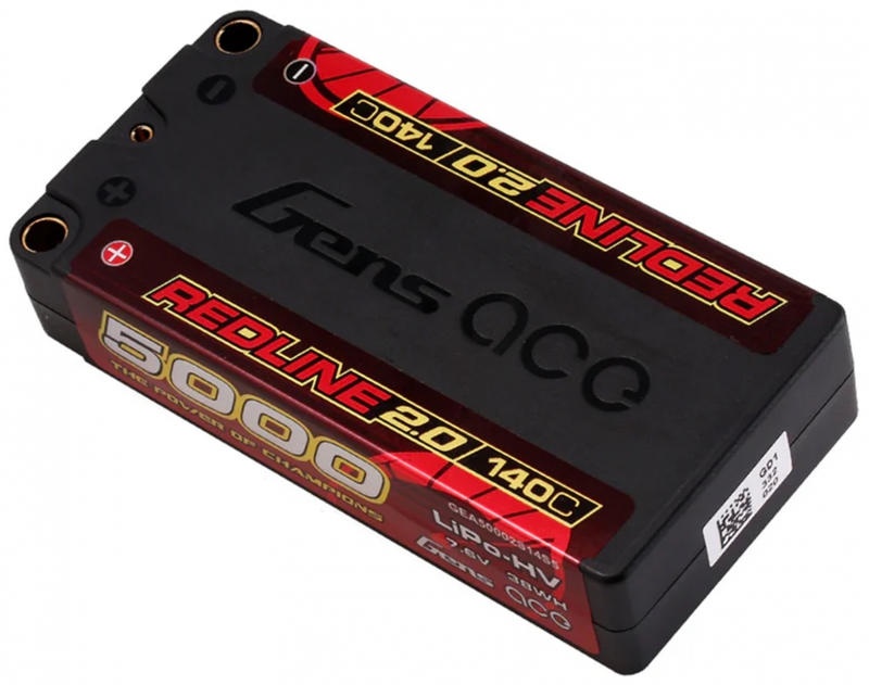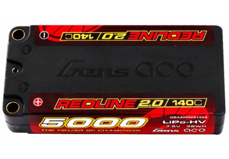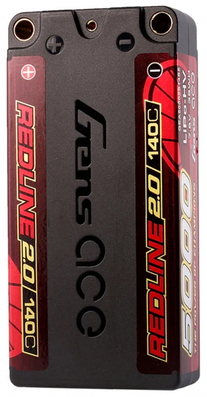 Gens ace Redline 2.0 Series 140C 5000mAh 2s Hardcase LiPo Battery Pack, with a factory installed 5.0mm bullet. Consumers trust the Gens ace name to deliver the dependability and high performance they expect. The Gens ace Redline LiPo battery pack has a high-capacity, high-discharge rate that gives you the power and run-time you expect.