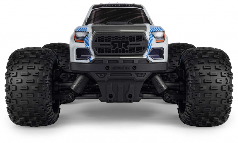 The ARRMA monster truck with foam-insert wheels and oil-filled coilover shocks is built to take hits and keep going. The oil-filled shocks smooth out rough terrain, while the foam-insert wheels absorb vibration and maintain traction. Impact-absorbing bumpers and a shock tower protector add structural resilience during aggressive driving. The driveshaft stone guard and adjustable battery straps further protect internal components and support varied battery sizes. These features combine to deliver a monster truck that’s not only tough but also refined in its handling and responsiveness.