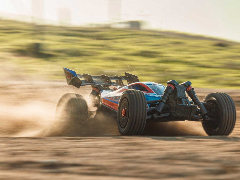 The ARRMA racing buggy with foam-insert wheels and oil-filled coilover shocks is built to take hits and keep going. The oil-filled shocks smooth out rough terrain, while the foam-insert wheels absorb vibration and maintain traction. Impact-absorbing bumpers and a shock tower protector add structural resilience during aggressive driving. The driveshaft stone guard and adjustable battery straps further protect internal components and support varied battery sizes. These features combine to deliver a racing buggy that’s not only tough but also refined in its handling and responsiveness.