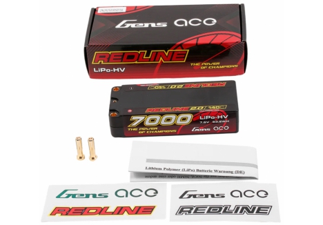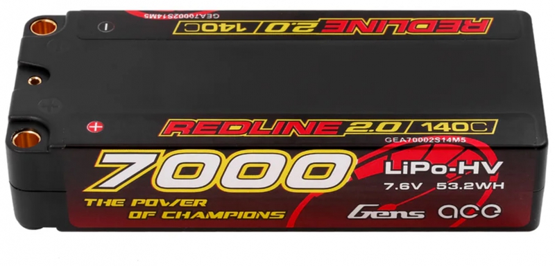 Gens Ace Redline 2.0 Series 2S 140C 7000mAh Hardcase LiPo Battery Pack; with a factory installed 5.0mm bullet. Consumers trust the Gens Ace name to deliver the dependability and high performance they expect. The Gens Ace 140C 2S 7000mAh 7.6V HV LiPo battery pack has a high-capacity; high-discharge rate that gives you the power and run-time you expect .