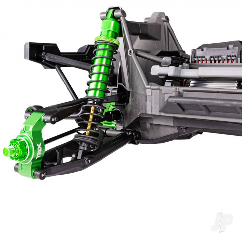 The Traxxas TRX77097-4-GRNX X-Maxx Ultimate 8S brushless monster truck features a heavily reinforced aluminium chassis that enhances structural integrity across all performance zones. This includes the suspension arms, steering bellcrank, and drivetrain supports. These upgrades are precision-machined to withstand high-impact landings, aggressive terrain, and sustained high-speed driving. The aluminium components reduce flex and improve responsiveness, allowing the truck to maintain stability and control even under extreme conditions. This level of durability is essential for serious off-road enthusiasts who push their vehicles to the limit.