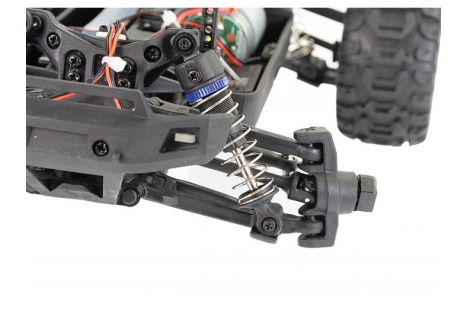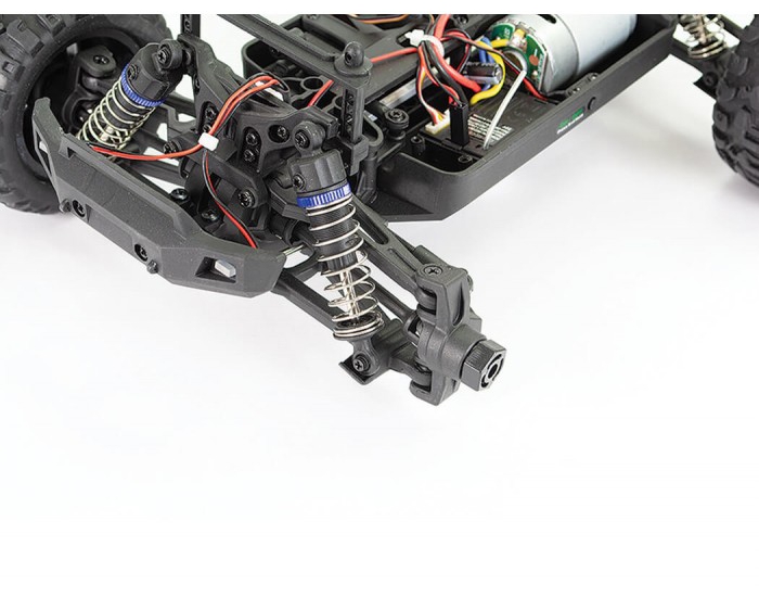 A new 100m range radio is provided to help control those longer speed runs and as with the brushed version, the Tracer brushless edition features coil sprung shock absorbers with multiple mounting points, double wishbone suspension and front universal driveshafts for smooth suspension movement while steering through the rough stuff. Shaft driven 4WD and with geared differentials front and rear provide traction in all conditions.