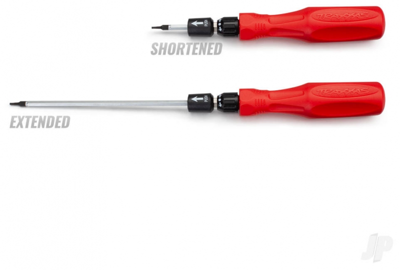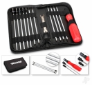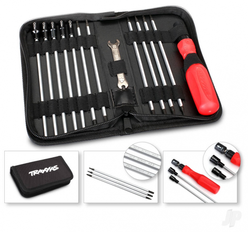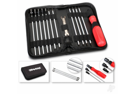 The Traxxas Tool Kit includes virtually every tool required to maintain Traxxas vehicles and stores them in a handy carrying case. A comfortable ratcheting handle allows the 11 included bits to telescope for those hard-to-reach screws. The kit includes nut drivers, hex drivers, standard and Phillips head screwdrivers and a wrench.