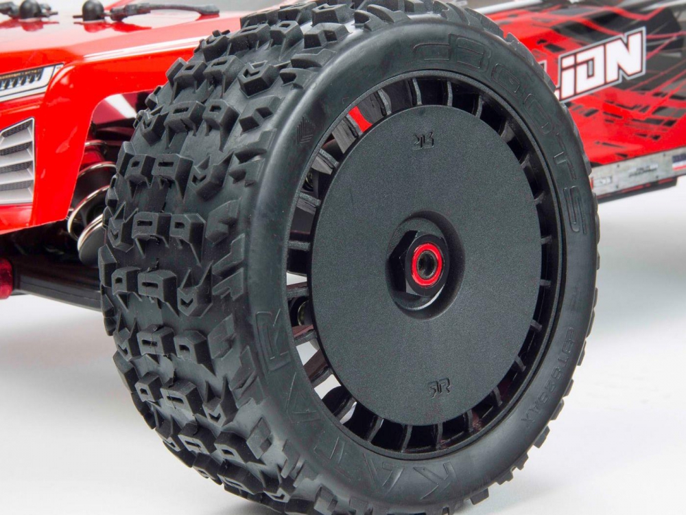 For the toughness needed to support its intense performance, ARRMA® builds the TALION™ 6S BLX 4WD on a strong, 3mm anodized aluminium chassis. Chassis components are all positioned to provide the best weight distribution for speed. Composite side pods, a center support and new aluminium center brace maximize chassis durability. All-metal diff outdrives and gearbox internals plus durable steel driveshafts contribute to an efficient, heavy-duty drivetrain that withstands extreme bashing. A new, "never loose" aluminium steering servo saver and "never pop" ball ends supply more precision, reliability, and confidence.