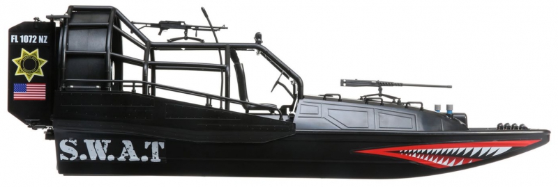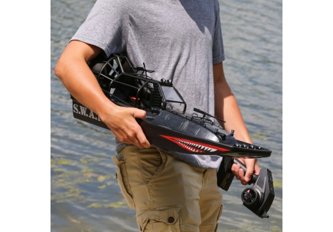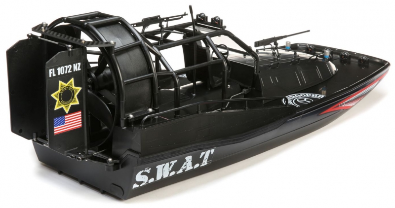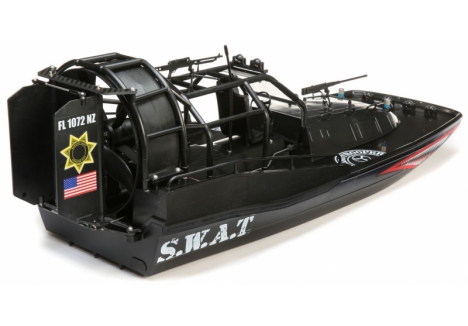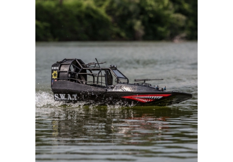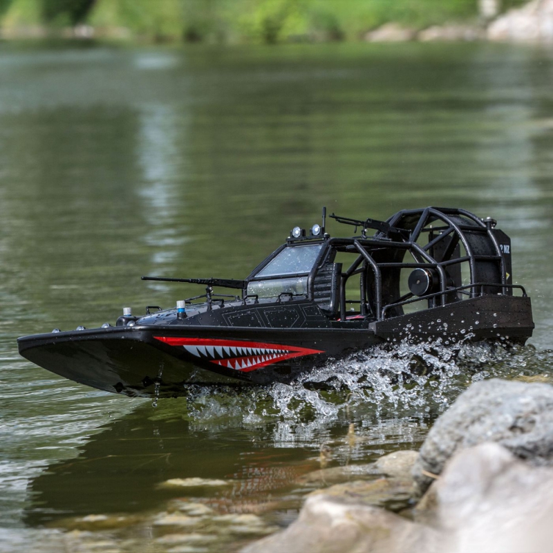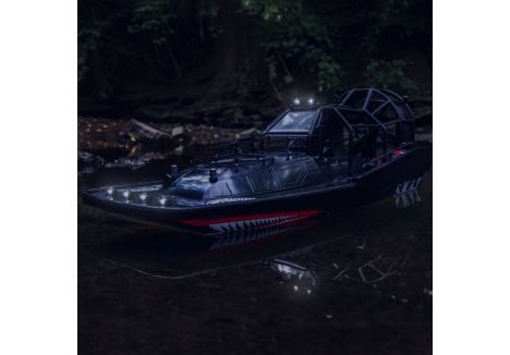 The Pro Boat waterproof tactical airboat with composite hull, LED lights, and 3-blade pusher prop is built for immersive terrain exploration. Its black tactical trim scheme and removable scale accessories—including molded guns and handrails—create a military-inspired aesthetic that complements its rugged performance. The elevated 3-blade pusher prop minimizes water intake and debris interference, while the LED lights extend usability into low-light conditions. Whether navigating plant-infested swamps or snow-covered fields, the Aerotrooper maintains visual realism and operational control.