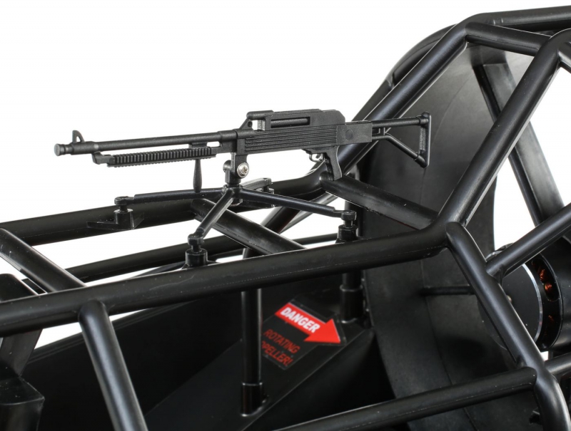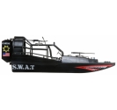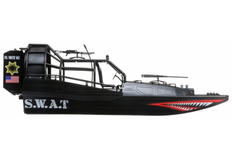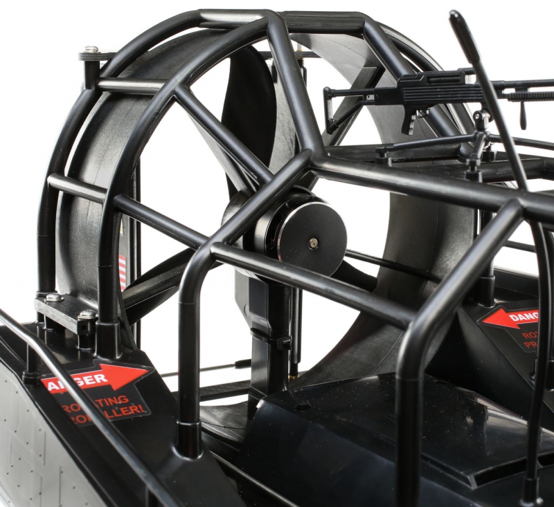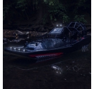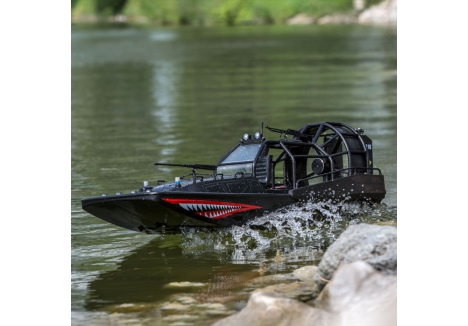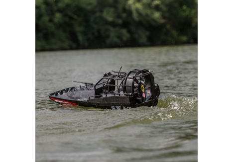 Run the Pro Boat Aerotrooper 25-inch Brushless Air Boat practically anywhere. Even on land! Featuring a 2080kv 480 Brushless outrunner motor with 3-blade airplane-style prop mounted above the hull, you can explore large bodies of water, plant-infested swamps, small grass fields, and even snow and ice. Keeping with the theme, a tactical/military hull scheme with removable guns, moulded handrails, and cage add to the scale realism. Plus, the scale cockpit with seat and steering fits most action figures. Injection moulded two-piece composite canopies are durable with a secure restraint system keeping all electronics safe during use. LED lights mean the fun doesn't stop when the sun goes down. Explore new terrain with a one-of-a-kind boating experience.