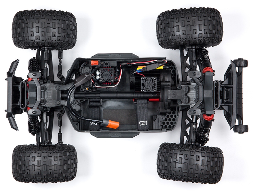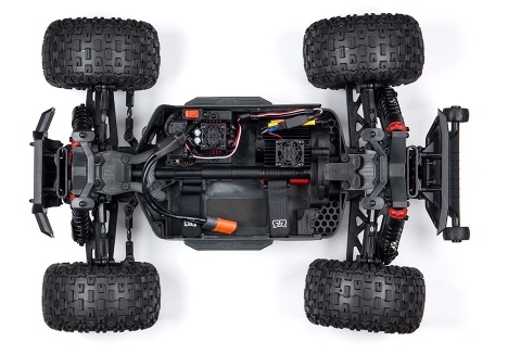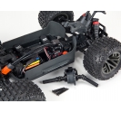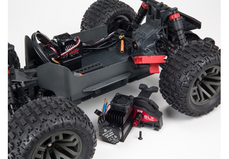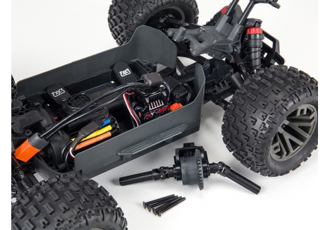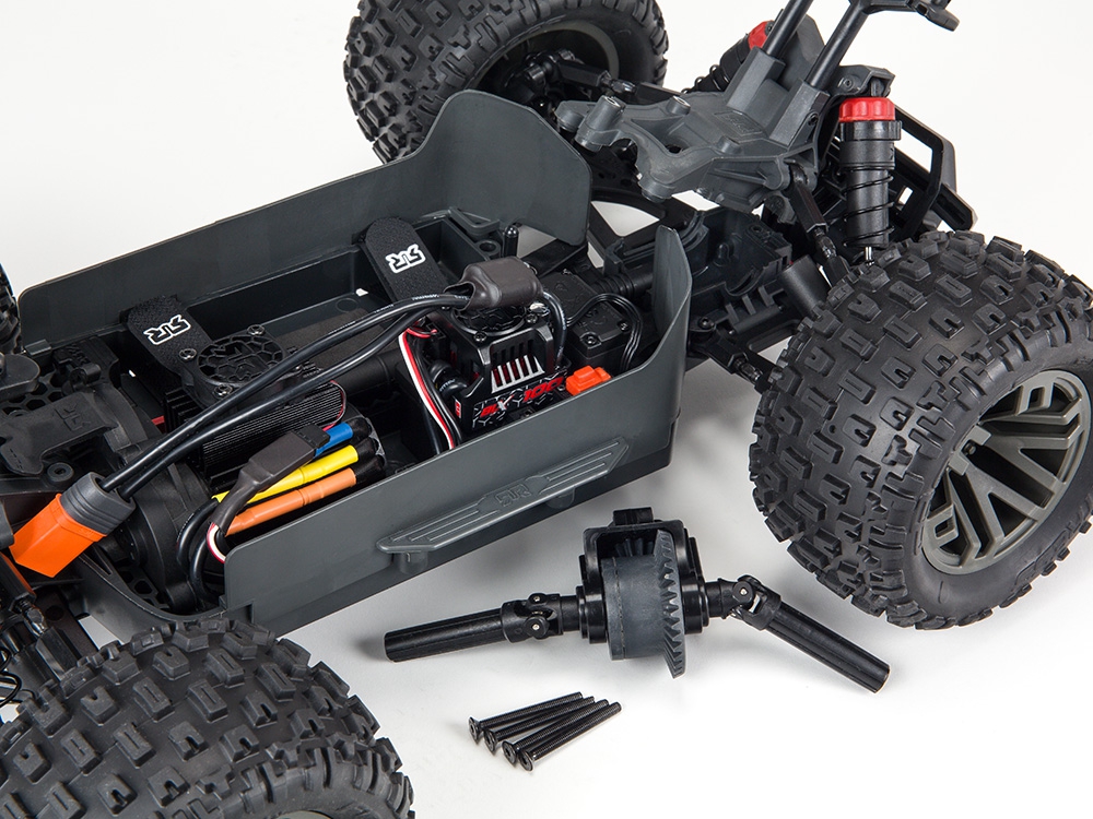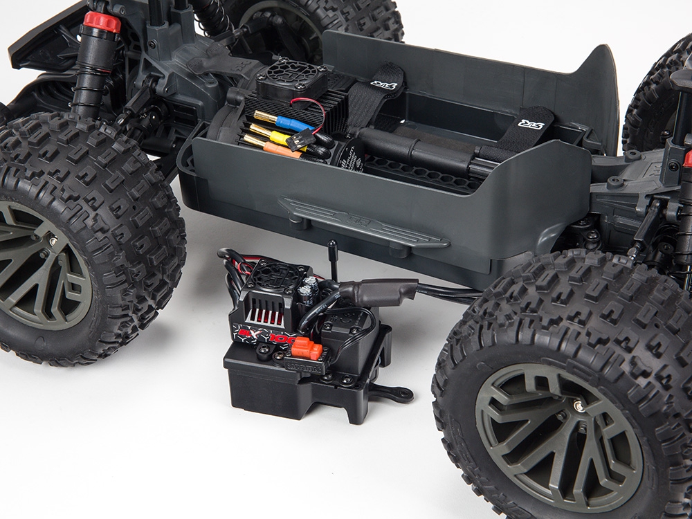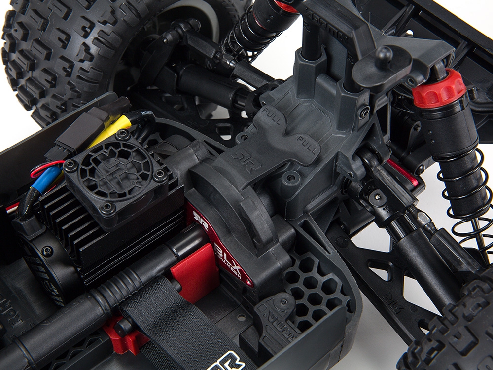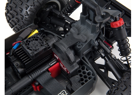 It has the ingenious modular design perfected by ARRMA® engineers for easy component access and maintenance. The power module, with improved dirt management, consists of the motor with ARRMA® heatsink and cooling fan, plus motor plate, slipper clutch assembly and gear cover. The power module can be detached from the chassis as a complete unit by removing just one screw. With the power module removed, the slipper clutch can be reached easily for adjustments by taking out three screws that attach the gear cover. The gear ratio can be finely tuned as the power module now uses a sliding motor mesh design.