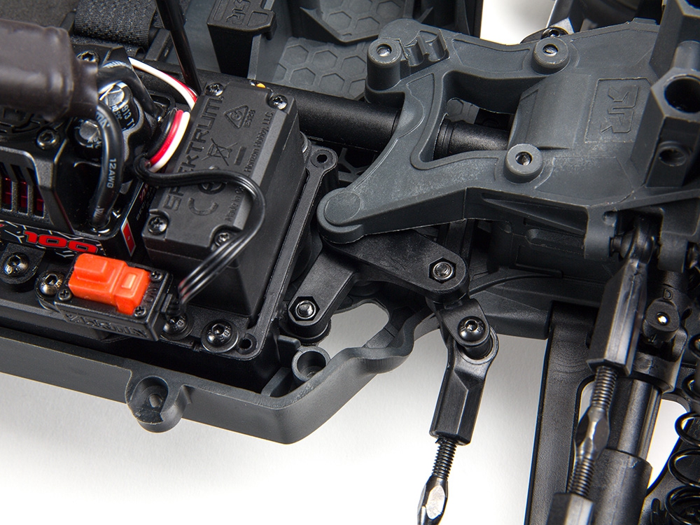 A two-piece molding screwed to the truck's chassis serves as its electronics module, containing a waterproof receiver box, servo mount and ESC tray. The SLR300 receiver mounts inside the receiver box for protection from dirt and moisture. The ultra-compact ESC is screwed to the top of the module, allowing quick access to the on/off switch, while the servo mounts to the side. All three components can be removed together, quickly and easily.