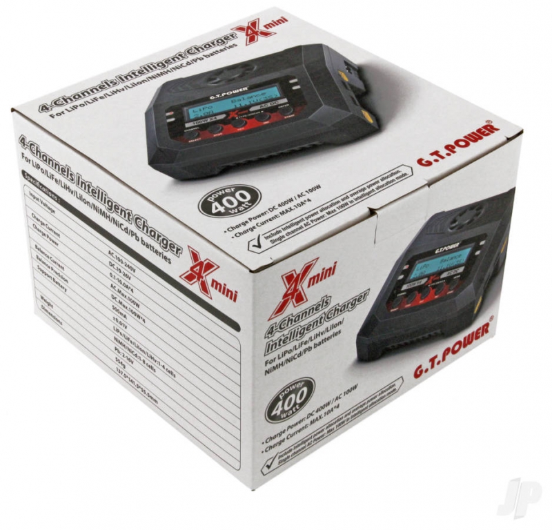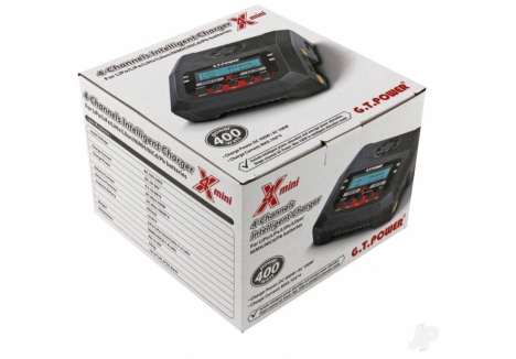 Charger manufacturers come and charger manufacturers go, however G.T. Power, it seems, is here to stay. Widely regarded as providing the best quality battery charging and care devices available in the RC world its products have made many friends over the years and, indeed, the X4 Mini is already following the trend. Offering an impressive 400W of charge power split between four independent 100W channels, the X4 is able to charge batteries with a much higher amperage in far less time. And, of course, with four outputs, up to four batteries can be charged at the same time, using completely separate charge routines. With a choice of mains or 19-26V DC input, the X4 is ideal for use at home or at the field. Moreover the backlit LCD makes it simple to select the charge parameters while also monitoring a battery's status in any light. Compatible with today's latest cell technologies this tidy unit is not only powerful and compact but convenient and versatile too, allowing it to travel with you to satisfy any number of multi-chemistry charging tasks.