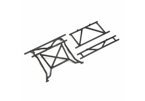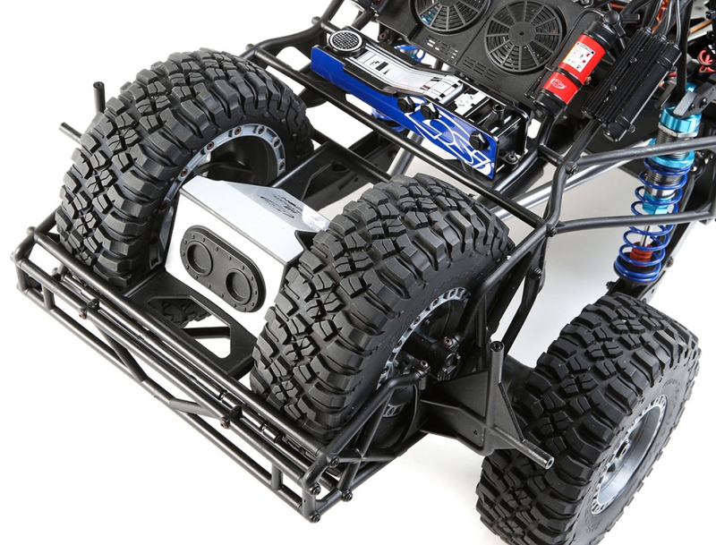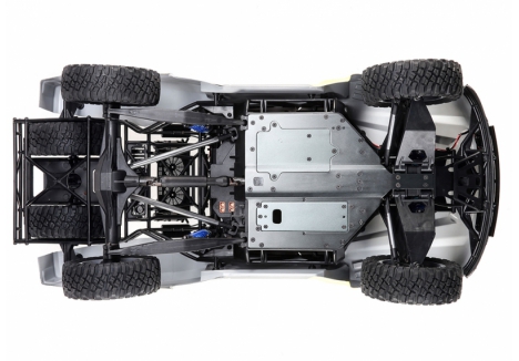 The Losi Super Baja Rey desert truck with bottom-loading battery tray and dual spare tyres offers a unique battery access system that simplifies power management. Unlike conventional setups that require body removal, the bottom-loading tray allows users to swap batteries quickly and securely. This design reduces downtime and eliminates the hassle of dealing with battery straps or body clips. Combined with the dual spare tyres mounted on the rear cage, the truck maintains a balanced weight distribution while enhancing its scale appearance. These features make the Super Baja Rey both practical and visually striking.