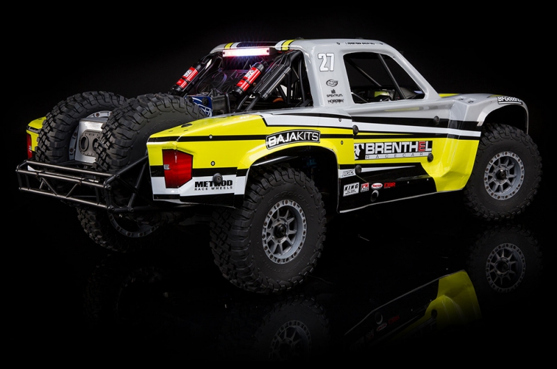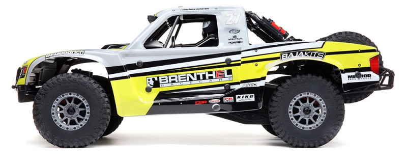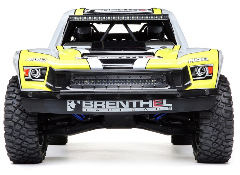 The Losi Super Baja Rey yellow desert truck with aluminium chassis and Brenthel body combines race-inspired aesthetics with structural strength. The one-piece painted Brenthel body replicates the look of full-scale trophy trucks, while the integrated composite roll cage adds rigidity and protection. The 4mm 6061-T6 aluminium chassis plate and upper deck provide a solid foundation for the drivetrain and suspension components. This combination of materials ensures that the truck can withstand impacts and maintain its shape under stress. The front bumper with realistic lower valance and Brenthel logo adds to the truck’s aggressive styling and authenticity.