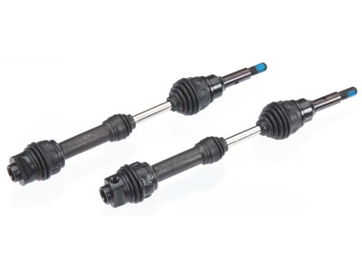 Traxxas Steel Constant Velocity Shafts offer the ultimate in torque handling and efficient power transfer. The outer U-joints are lubricated and sealed by a rubber boot for maximum protection against the elements, and the U-joint pins are held captive so you never have to worry about losing a pin. Gleaming nickel-plated shafts and black silicone boots add a custom look.