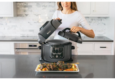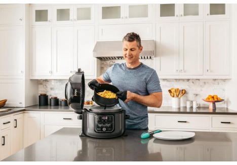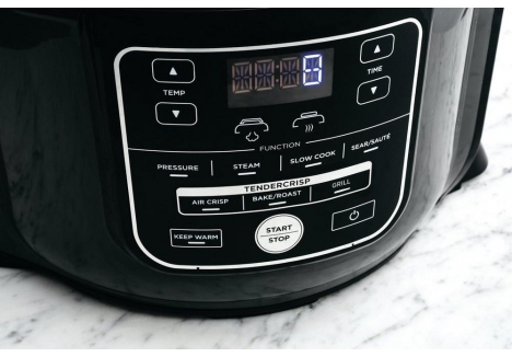 Pressure Cook – Heated steam quickly cooks steaks, chilli, and other foods up to 70% faster than other cooking methods. Air Frying – Serve French fries or crisps using little to no oil. The result is guilt-free food with up to 75% less fat than traditional frying. Slow Cook – With adjustable timing and temperature controls, you can have a casserole or stew ready when you get home. Sear/Sauté – Whether you need onions for your hotdogs or you’re searing meat for your roast, this option has you covered. Bake/Roast – From roasting joints to baking delicious cakes, the variable temperature settings give you complete control. There’s also Steam and Grill options for complete cooking flexibility. And, switching between the different functions is simple thanks to the intuitive display.