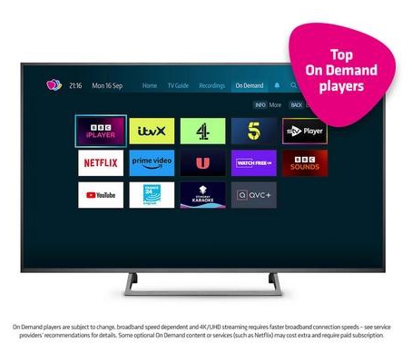- Smart apps: BBC iPlayer, ITVX, My5, UKTV Play, STV Player, YouTube, Netflix, Prime Video, BritBox