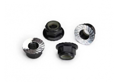 Lightweight and great looking, these 5 mm anodised aluminium flanged lock nuts are the perfect finishing touch for your vehicle. The serrated flange and nylon locking washer keep them snug on the wheel during even the most intense action. Sold as a set of four.