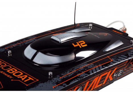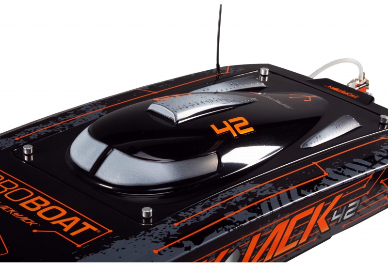 The Pro Boat Blackjack 42 inch Smart RC boat with polycarbonate canopy is built to endure demanding environments. The impact-resistant polycarbonate hull features a two-piece shoebox construction that enhances durability and rigidity. The canopy, also made of polycarbonate, includes aluminium thumb screws for a secure, watertight seal without the need for hatch tape. These design elements ensure that the boat remains protected and operational even during aggressive racing sessions or unexpected collisions.