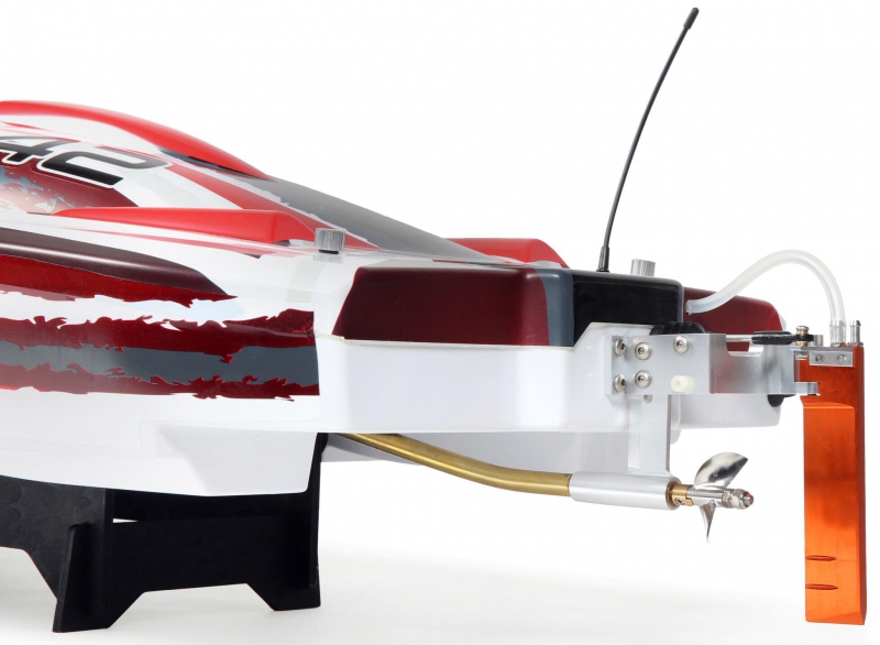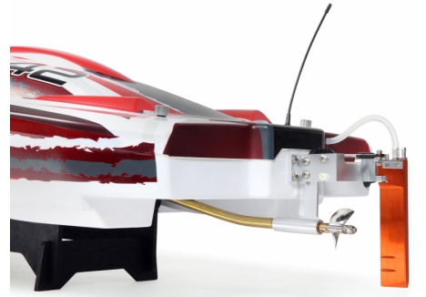 The Pro Boat Blackjack 42 PRB08043T2 with impact-resistant polycarbonate hull and aluminium rudder is engineered to withstand the rigours of high-speed water racing. The hull is constructed from 2.5 mm polycarbonate reinforced with a full moulded composite interior, offering superior impact resistance compared to traditional fibreglass. The anodised aluminium rudder features a breakaway mechanism that protects the hull from damage caused by floating debris. These materials and design elements ensure long-lasting durability and reduce the risk of structural failure during aggressive manoeuvres.
