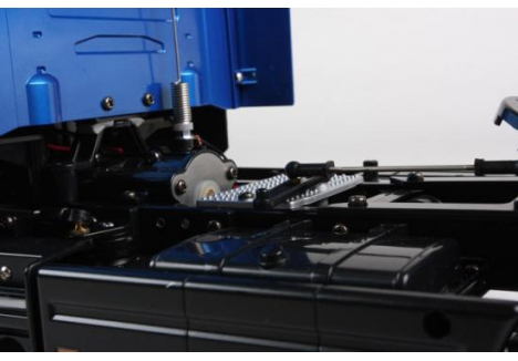 The Tamiya Scania R470 with ABS body, metal bushings, and compatibility with flatbed, tank, and pole trailers features a transmitter-controlled 3-speed gearbox that allows users to shift gears on the fly. With adjustable ratios of 32.49:1 (low), 17.76:1 (medium), and 10.66:1 (high), the transmission replicates the torque and speed dynamics of full-size trucks. This setup enables realistic acceleration, low-speed maneuvering, and highway cruising—all controllable via a 4-channel transmitter. The gearbox is front-mounted and powers the twin rear axles, ensuring balanced traction and scale performance.