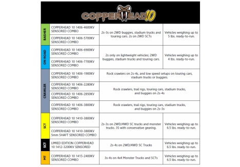 For crawler setups or others that do not require an ESC cooling fan, the fan is easily removed with four screws and the fan guard with the cool COPPERHEAD logo simply clicks back into place on the top of the ESC. It keeps the COPPERHEAD 10 looking mean and provides an extra measure of protection. To further protect your investment, the COPPERHEAD emits audible alerts for easy diagnosis of common issues such as motor-over-temperature and low-voltage cutoff. You'll find a handy decal in your box that contains a reference chart for the eight alert tones, no need to Google while your enjoying your wheel time!
