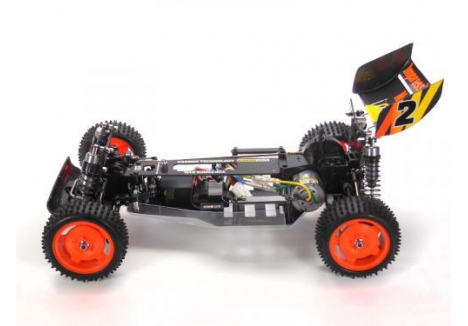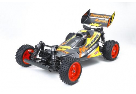 This R/C model assembly kit is a re-released and updated version of Top-Force EVO., first released in 1992. Its lightweight and highly rigid double deck frame covers front/rear gearboxes with 2mm thickness carbon fiber upper and lower plates, and facilitates easy maintenance.