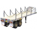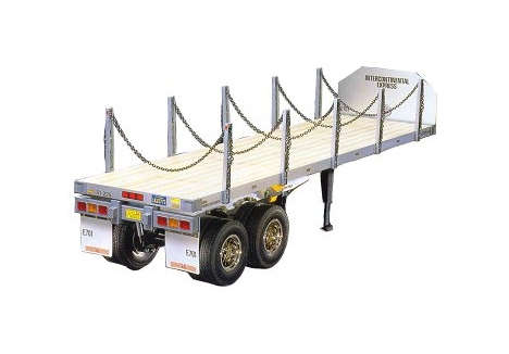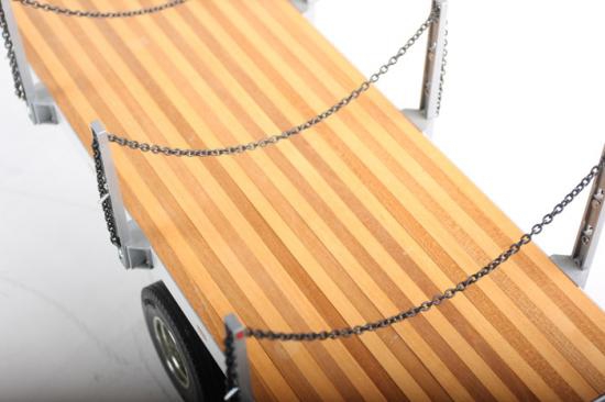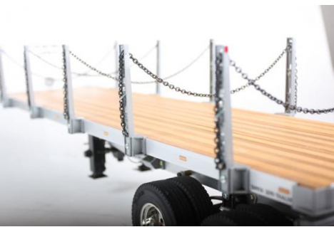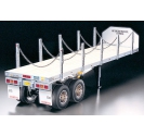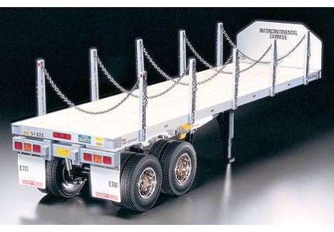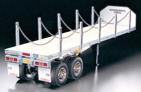 This highly realistic 1/14 scale flat-bead semi-trailer model is for use in combination with Tamiyas 1/14 R/C tractor truck. A scale appearance is achieved by using authentic components such as aluminium chassis/frame, wood-floored platform and actual chains.