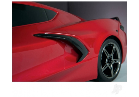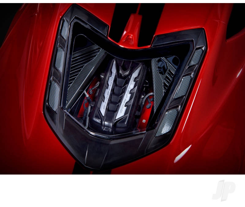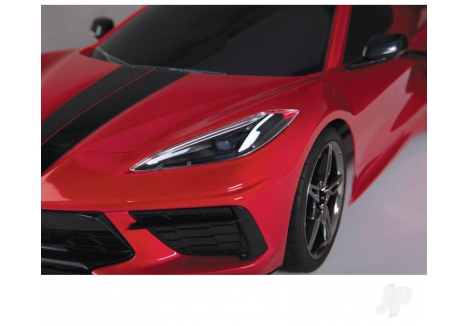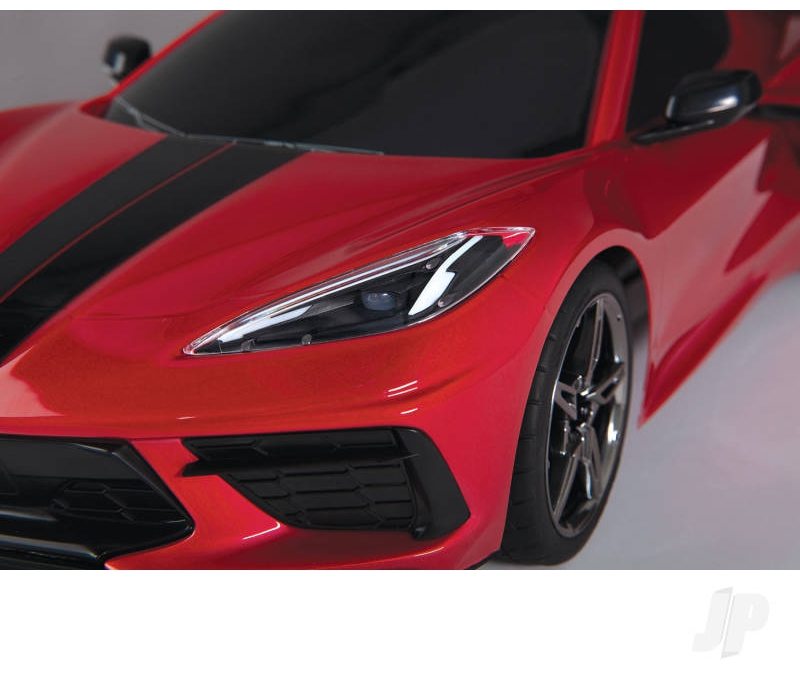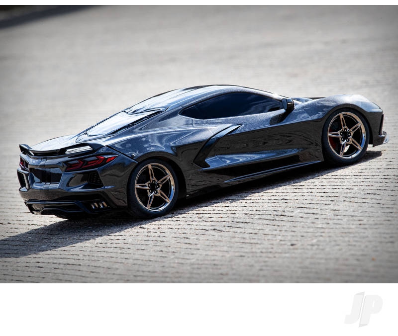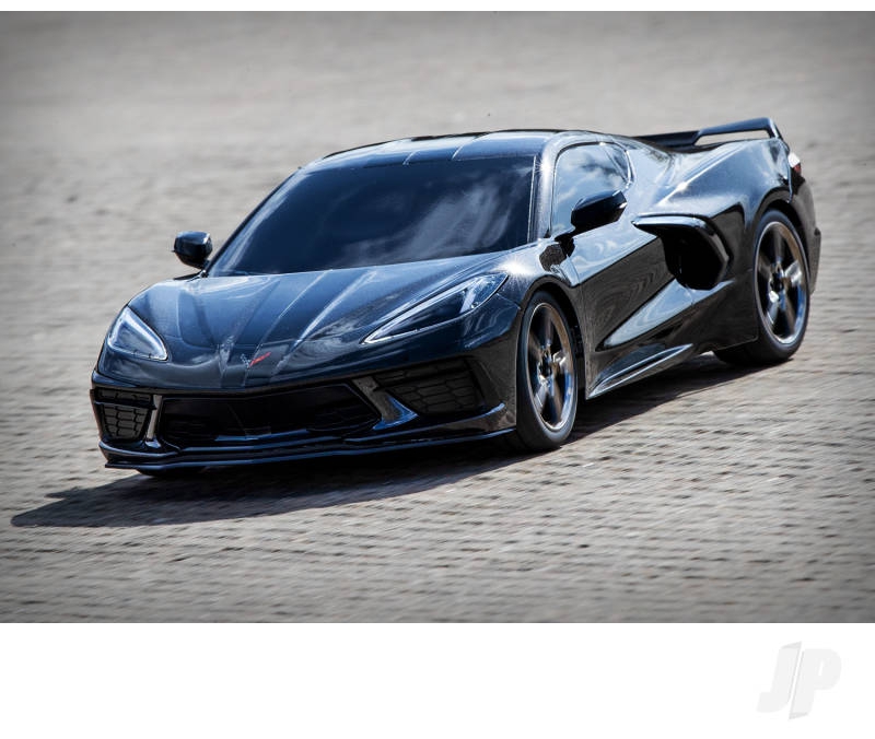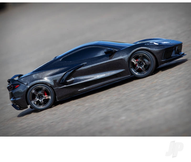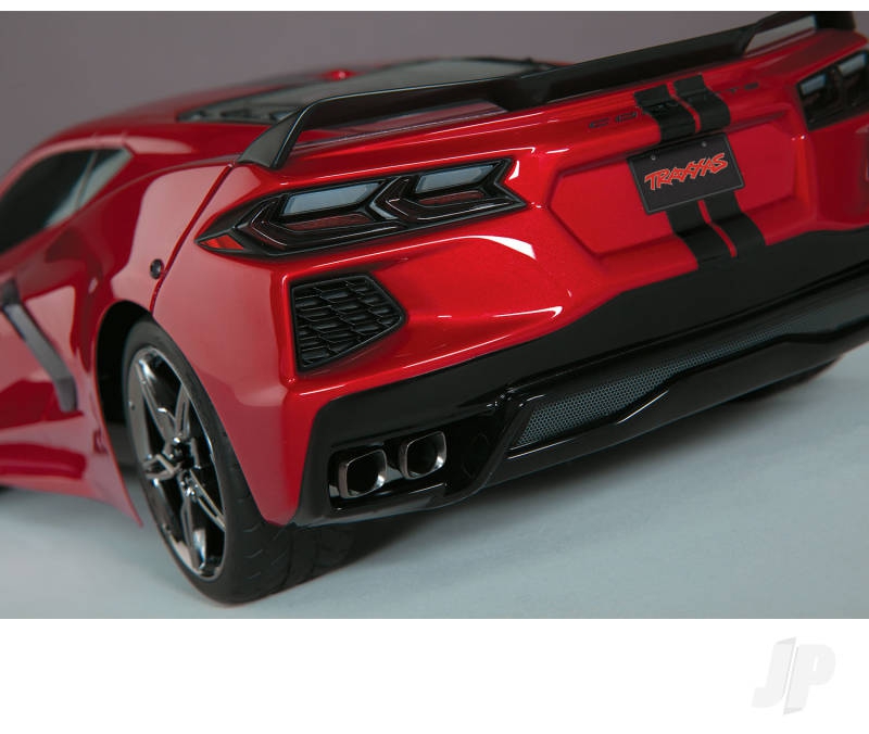 The name is synonymous with American sportscar excellence: Corvette. Traxxas delivers the spirit and excitement of the all-new mid-engine Corvette in exacting detail, for a replica that performs as realistically as it looks. The faceted, jet-fighter body and its massive side intakes are duplicated to the millimeter. The simulated LT2 V8 is visible beneath the rear hatch. Authentic black-chrome wheels fill the fenders. Beautiful to display—with Traxxas performance that demands you to drive.
