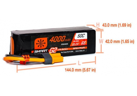 - Product Type – Spektrum SPMX46S50 Smart G2 6S LiPo battery with 4000mAh capacity, 50C discharge, and IC5 connector, Spektrum 22.2V LiPo with integrated microchip, auto storage discharge, and 10 AWG wire gauge, Spektrum Smart battery with soft case, 615g weight, and 5C max charge rate, Spektrum SPMX46S50 with 144mm length, 43mm height, and 42mm width for air and surface applications, 6-cell 22.2V LiPo with Smart telemetry, charge protection circuitry, and EC5 connector compatibility