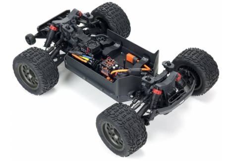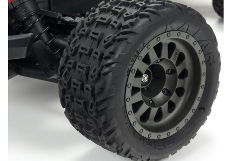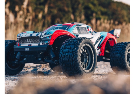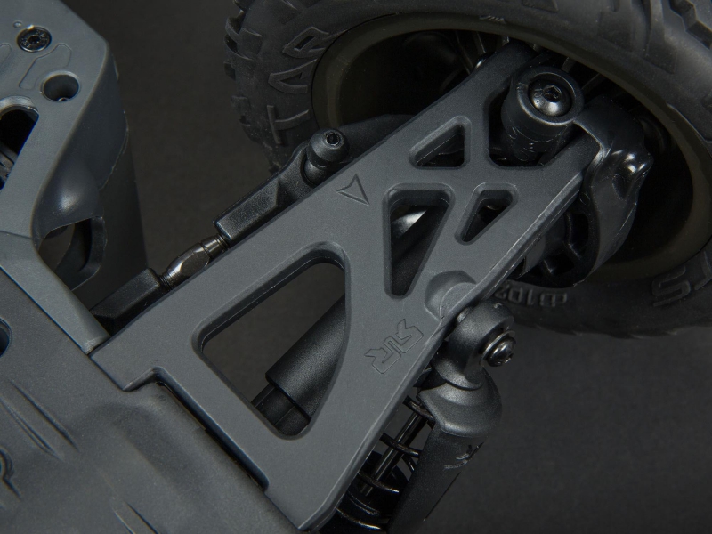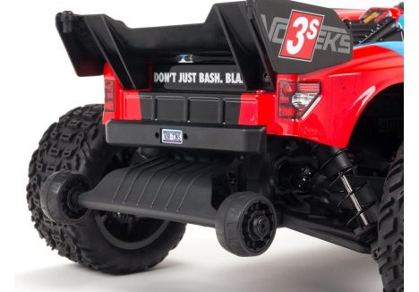 The proven tough ARRMA® 4X4 platform lets you bash at high speeds in almost any environment - off-road, on dirt and grass, on parking lots and over paved and asphalt surfaces. Its durability comes from a strong composite chassis featuring extended height dirt defenders, oil-filled shocks with silicone O-rings, metal geared differentials and more. Rugged bumpers and high-traction dBoots® Katar™ tyres mounted on tough, gun-metal colored wheels add to its unstoppable performance. The VORTEKS™ 4X4 3S BLX also includes a sleek, new stadium truck body with tough, injection-moulded wing and protective roof skids.