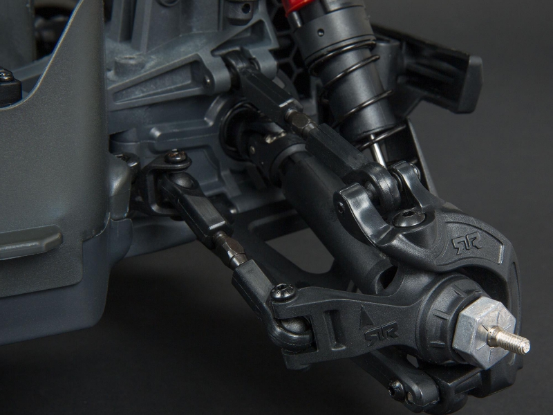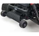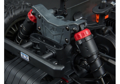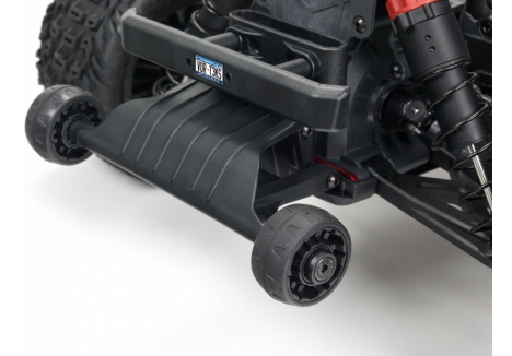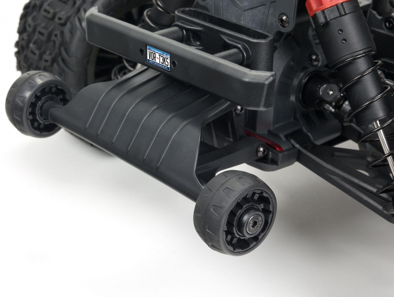 The sleek stadium truck body features a tough, injection-moulded rear wing and protective roof skids. It's available finished in your choice of three exciting color combinations. Front and rear bumpers protect against impacts and a wheelie bar provides stunt potential.