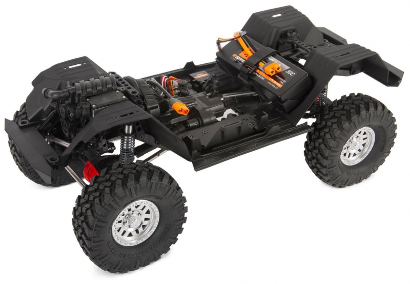 The SCX10™ III Jeep® JL Wrangler kit uses portal axles to improve performance by increasing the ground clearance and reducing torque twist. Its standard battery tray accepts full-size standard LiPo or NiMH packs. There's also space on the side rails for drivers who prefer shorty packs. Inner fenders and floor sides hide internal components that would usually be visible from the side of the chassis.