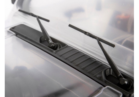 The clear scale Jeep® Wrangler Unlimited body mirrors its full-size counterpart with a detailed interior for super scale looks. The interior has a molded roll cage, steering wheel, and driver head. There are many molded scale details on the body, too: front radiator/light buckets; front hood vents; front cowl; windshield wipers; mirrors; door handles; and fuel door.