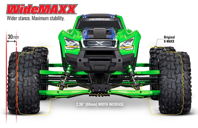 The Traxxas X-Maxx is a new breed of monster truck with a tough-as-nails attitude, brutal power, and unrivalled durability. The WideMaxx kit builds on the X-Maxx s already legendary performance by widening the stance 60 mm for even greater cornering stability. Take your X-Maxx to the next level with the WideMaxx kit and get ready for the ultimate expression of Traxxas Tough.