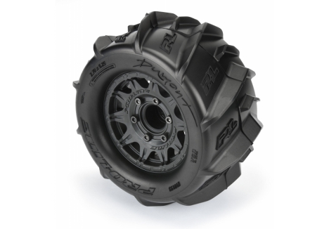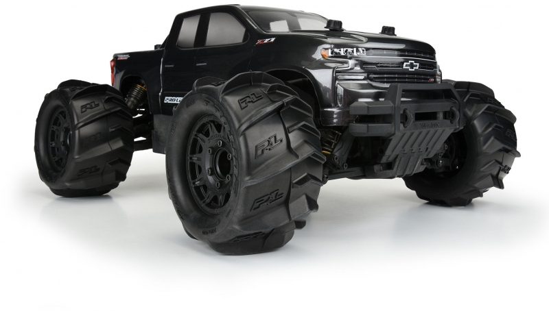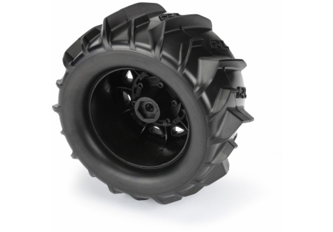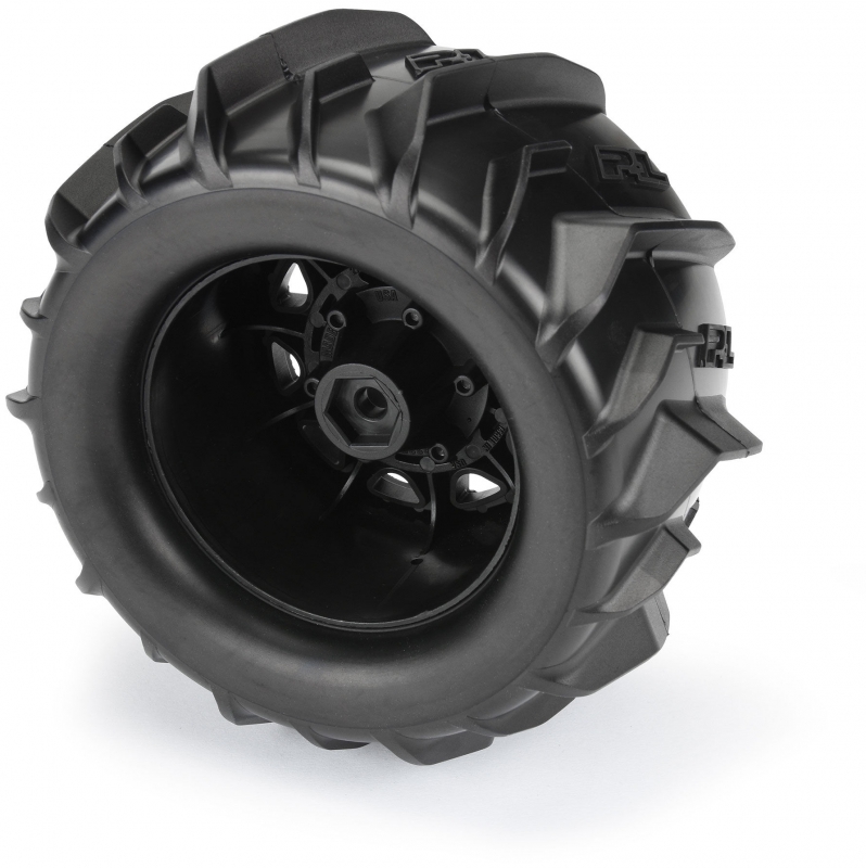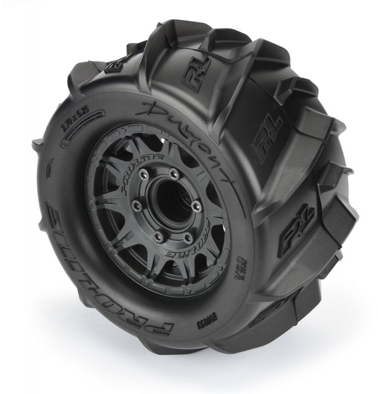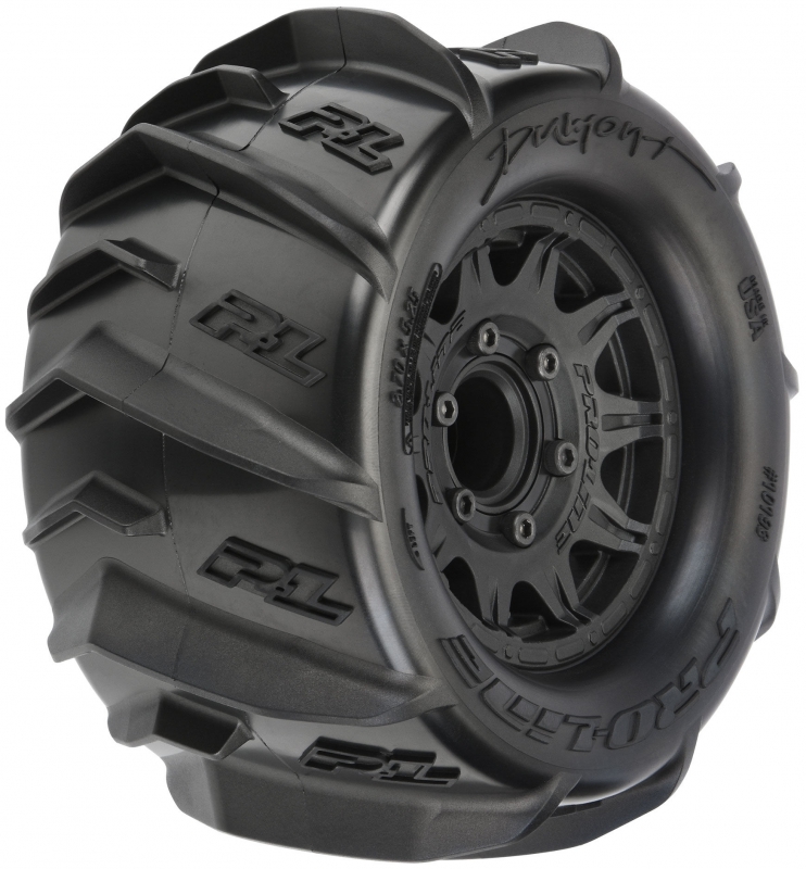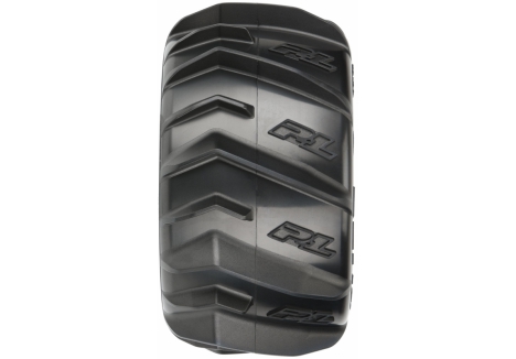 The Dumont 2.8" tire uses the latest in paddle tread technology with large offset V-shaped paddles for maximum roosting power. Pro-Line P-L logos have been embedded into the tire carcass giving it the style that you have come to expect from Pro-Line. The Dumont Paddle tire gets its name from the incredible Dumont Sand Dunes in California, but these paddle tires are equally at home shredding your local snowfield in the winter. Don't get stuck spinning your tires in the sand or snow. Get a set of pre-mounted Dumont Paddle tires for your 1:10 Monster Truck today!