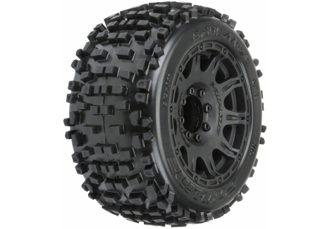 The Badlands 3.8" tires now come Pre-Mounted on the next generation 3.8" wheel design from Pro-Line, the Raid 3.8" Removable Hex Wheel! Imagine being able to replace a damaged wheel hex without needing to replace your glued tires! These new Raid 3.8" wheels make this possible by using a unique 8x32 interlocking hex design that is secured to the wheel by 8 M3 screws that are spaced 32mm across. The hexes are included and are also available separately (PRO634500). The built-in adjustability and ease of use make this a new must-have wheel for bashers everywhere! Be the first to own the latest and greatest technology from Pro-Line, get the new pre-mounted Badlands 3.8" tires now!