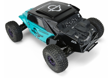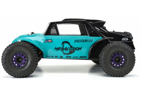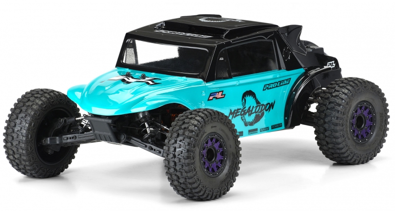 This is a Megalodon Desert Buggy Clear Body. Pro-Line is proud to   release a clear version of The Megalodon: a dune-shredding,   wheelie-popping, supercharged V8-powered beast of a buggy! Transform the   looks of your Slash® 2wd or Slash® 4x4 with this super scale body! All   the scale details of this beast of a buggy are captured including molded   engine details, roof-mounted air scoop, add-on rear fenders, and   shark-inspired side wings. To create the most scale Megalodon possible,   we recommend using SCXL 2.2"/3.0" tires for that killer oversized   look. This body comes clear so you can customize the look and paint it   however you want! Thrash your local bash spot with the new Megalodon   body from Pro-Line!