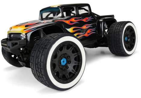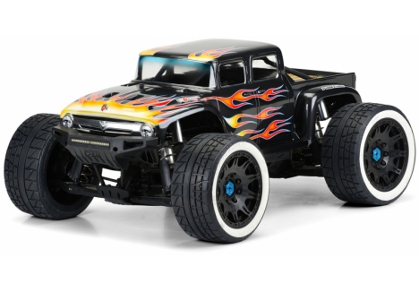 This is a 1956 Ford® F-100 Clear Body for X-MAXX®. Pro-Line is excited to bring some retro classic styling to the X-MAXX® for the first time! This old-school Ford F-100 body completely transforms the look of your truck, featuring a custom hot-rod style extended cab, aggressive fender flares, and the iconic old-school chrome grill of the '56 blue oval fan favorite. Pair the F-100 with the Menace 5.7" Belted Tires (PRO1020510) for a true street machine combo!