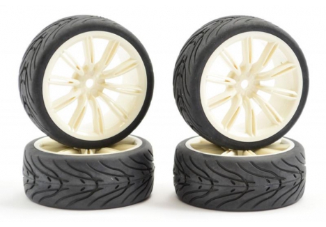Pre-Mounted sets of 4 wheels and tyres. For 1/10th touring, drift or rally cars with a 12mm hex fit.