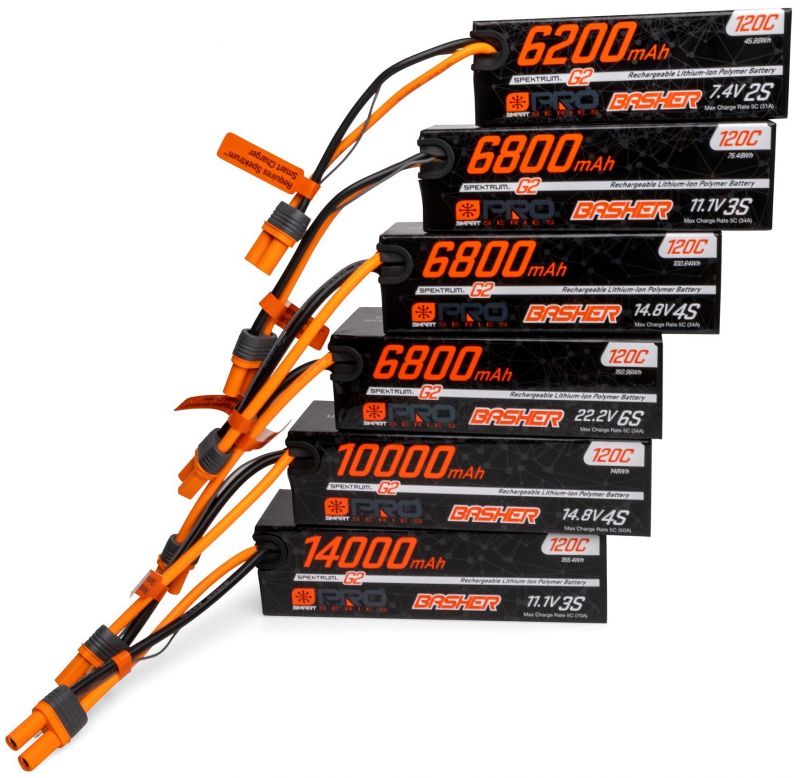 For RC Bashers, maximum capacity and power are key, and the new Spektrum Smart Pro Basher Series batteries deliver! The Pro series batteries allow for more capacity to be squeezed into the LiPo cells, allowing for larger mAh ratings when compared to similarly sized battery packs. The Pro Basher Series features a newly designed hardcase shell that is thinner and more lightweight, all the while staying rigid, durable, and impact resistant. This series lives alongside current Smart G1 and G2 batteries and is an upgrade to standard hardcase surface packs.